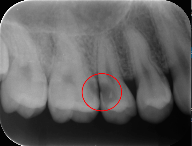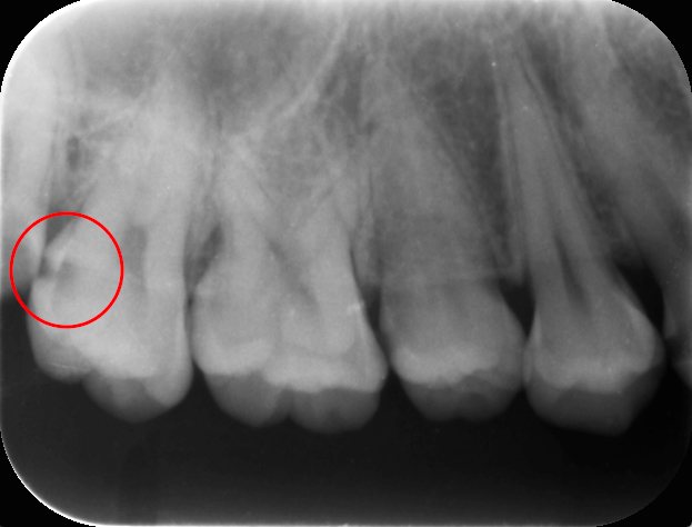 上の画像の赤い丸の部分が虫歯です。この虫歯は口の中を直接見るだけではみつかりません。