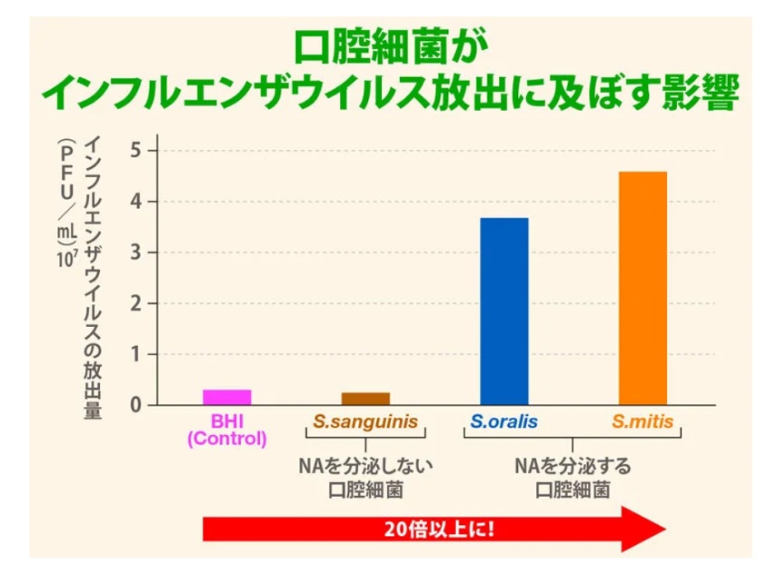 口腔内や気道に存在するブドウ球菌や歯周病菌には、このHAを活性化するプロテアーゼという酵素を産生するものがあり、インフルエンザウイルスの感染を助けている可能性が指摘されています。