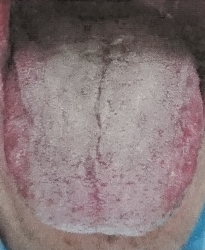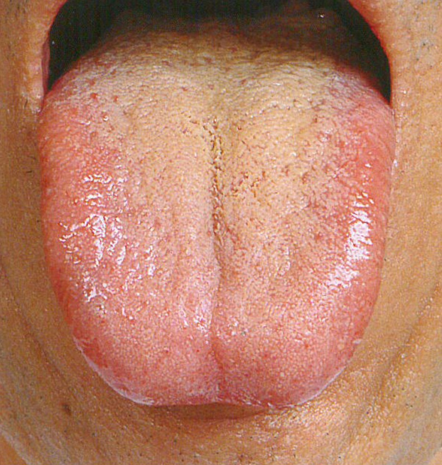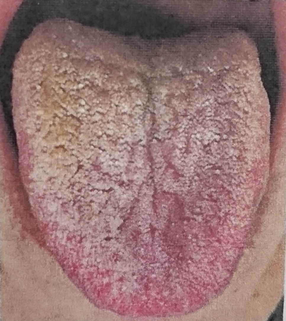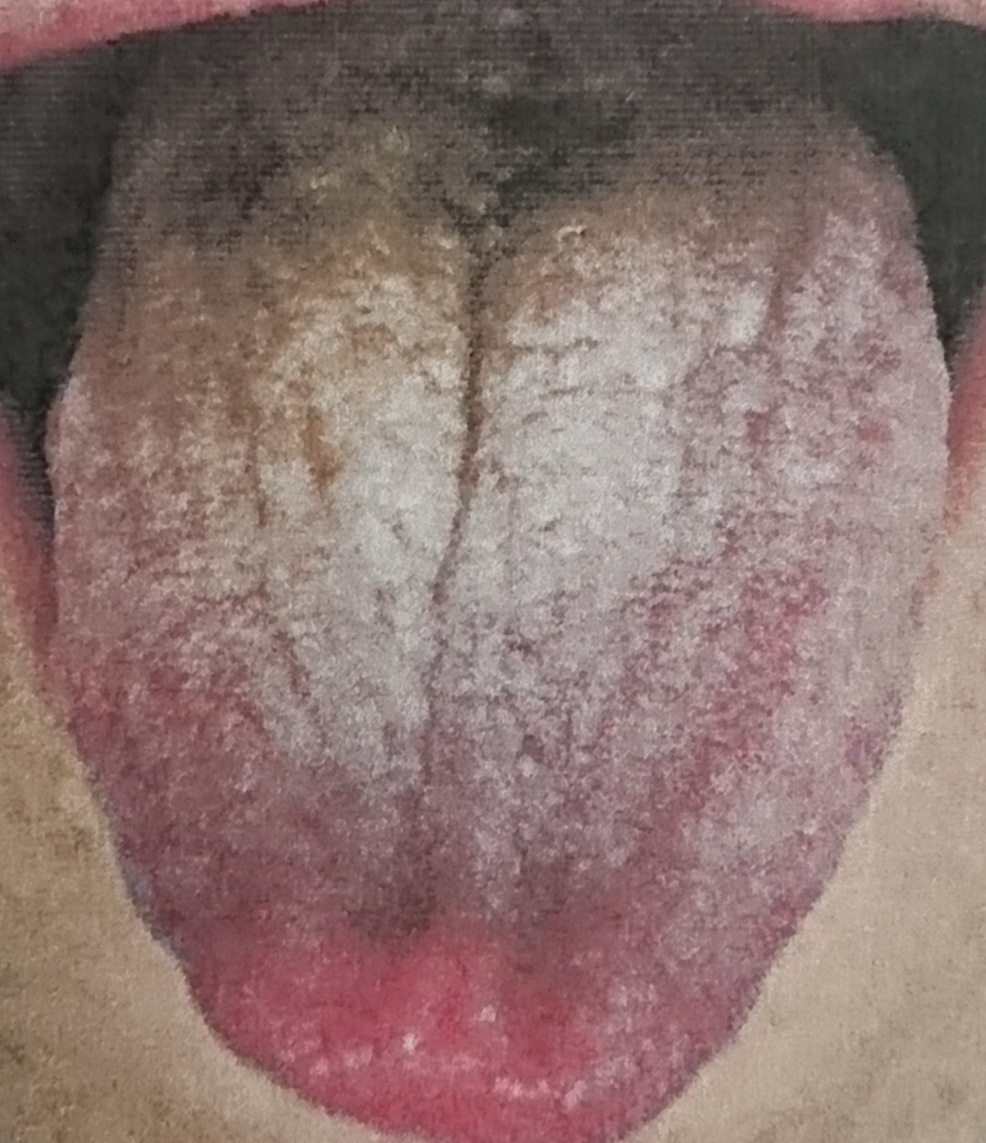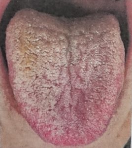 ●分厚い舌苔が黄色く、乾燥している︰黄厚膩苔(おうこうじたい)