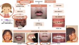 お口の発達が弱いと、「歯並び」や「口のまわりの形態」に影響するだけでなく、飲み込みの機能の発達不全・いびきや睡眠時無呼吸症候群・アレルギー疾患などにも影響があると言われます。