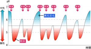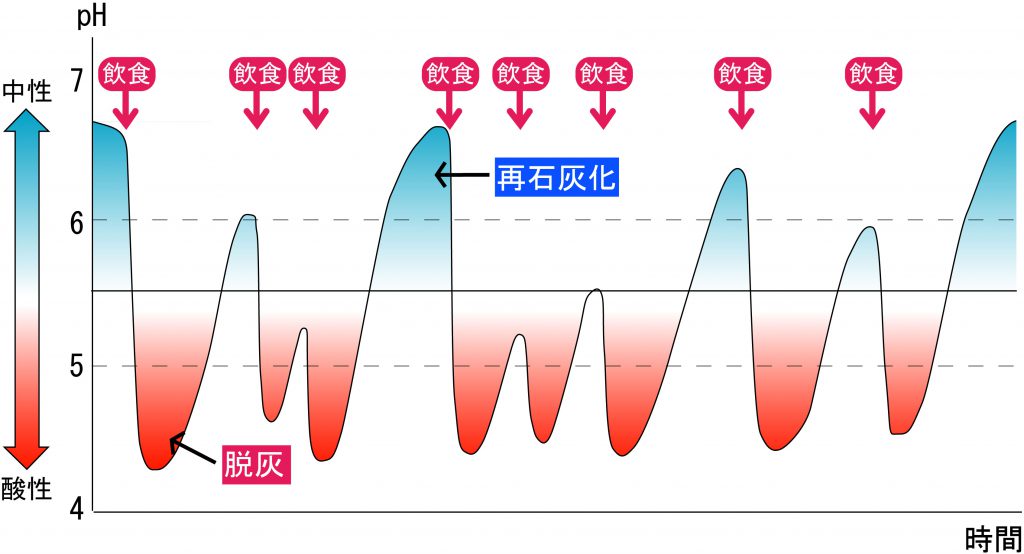 歯垢が付着している歯の表面ではこの脱灰と再石灰化が繰り返しおこなわれていて、脱灰される時間が長いほど虫歯になりやすくなります👿