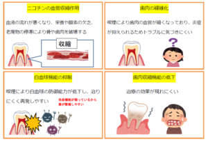 簡単に説明すると、タバコを吸うとニコチンの作用で血管が収縮し、歯茎に血液の栄養が運ばれなくなり、栄養不足の弱い歯茎になります。