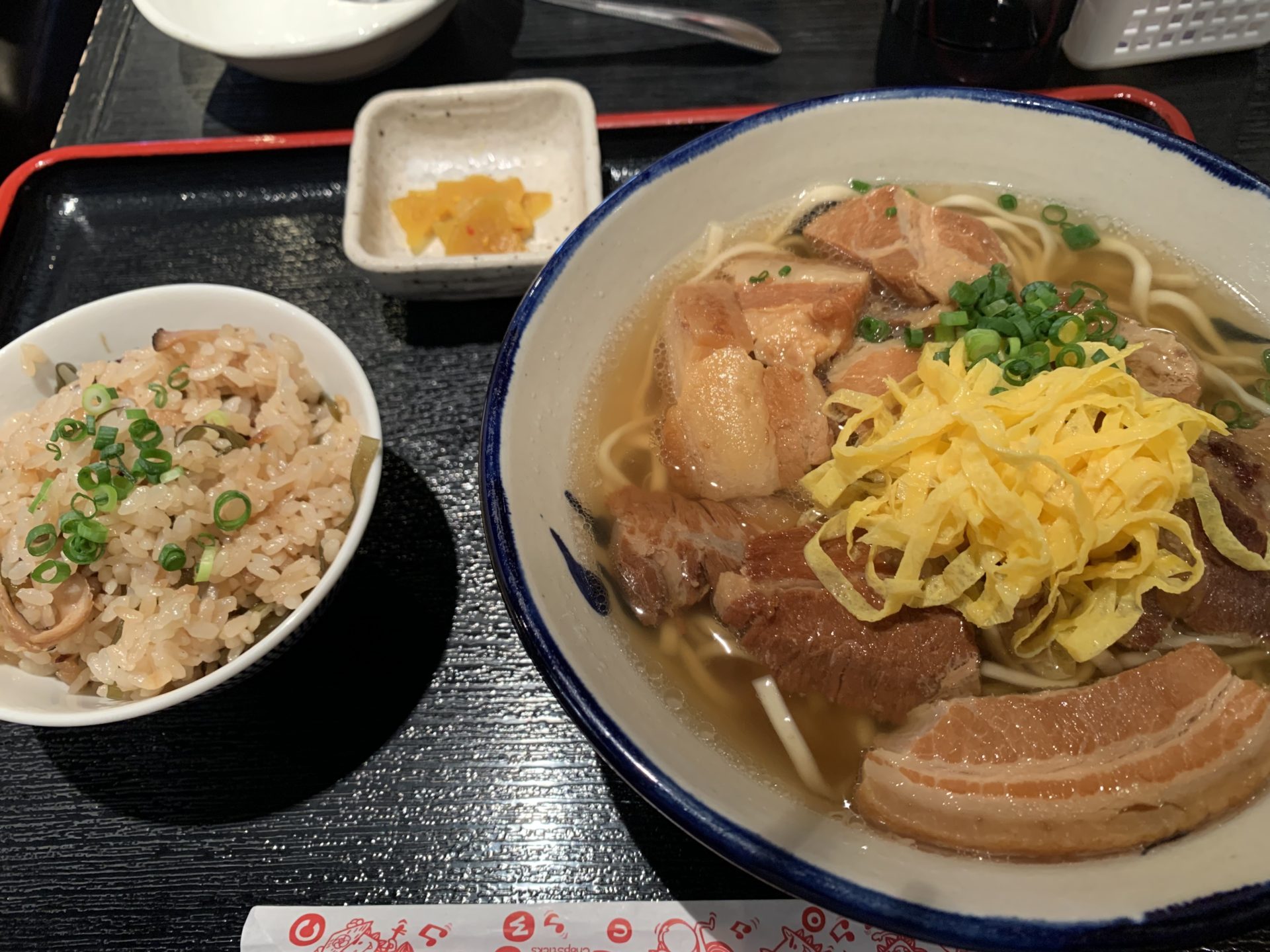 大好きなジューシー(炊き込みご飯)と三枚肉の沖縄そばです🌺すごく美味しかったです