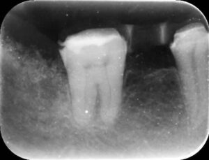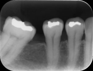 上のレントゲン写真のように奥歯が手前に傾いてしまっている歯を正しい位置に戻してあげる治療です。